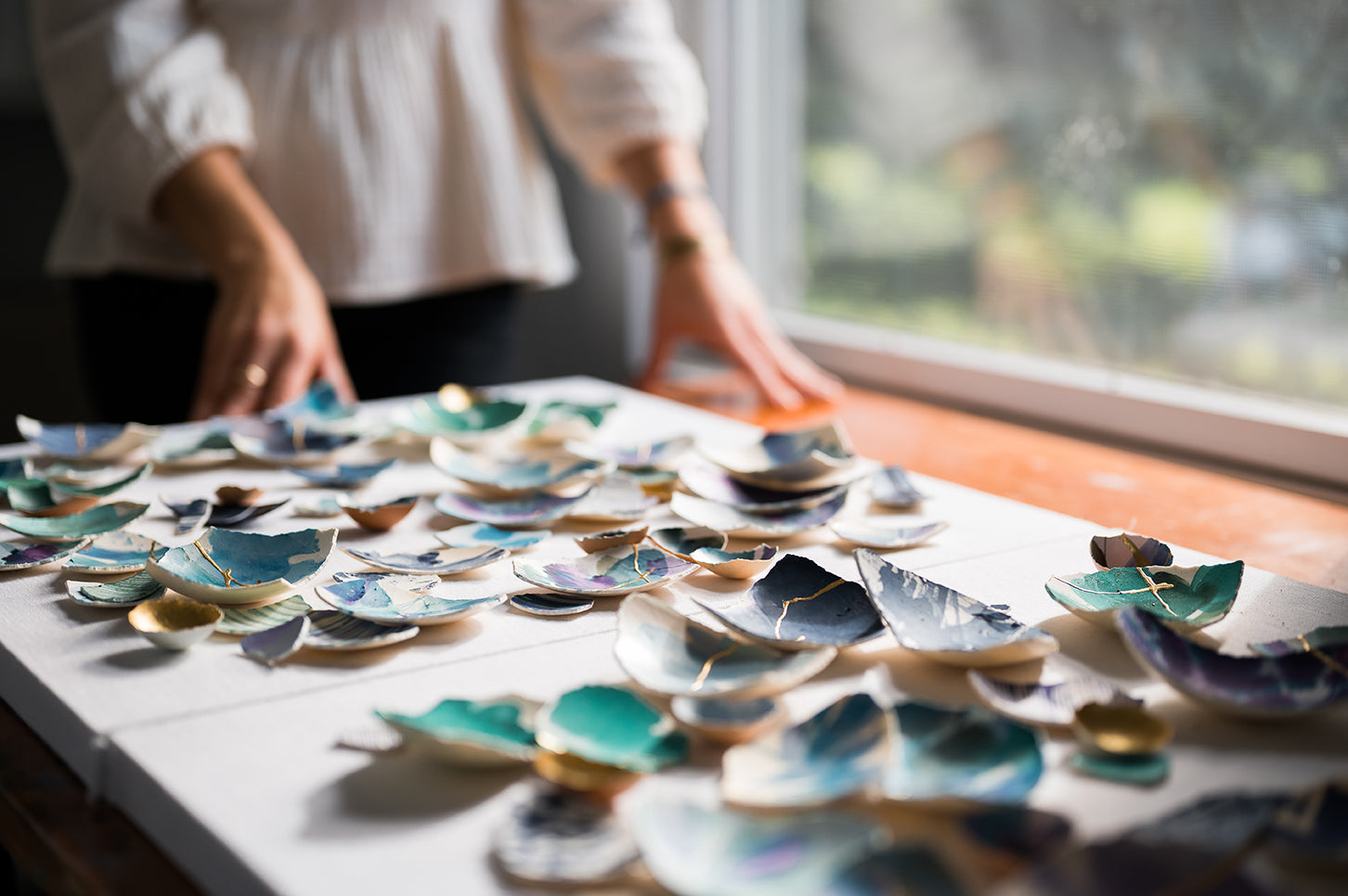 Working from the beautiful concepts of kintsugi, Elisa creates a visual interpretation of that craft in eggshells.