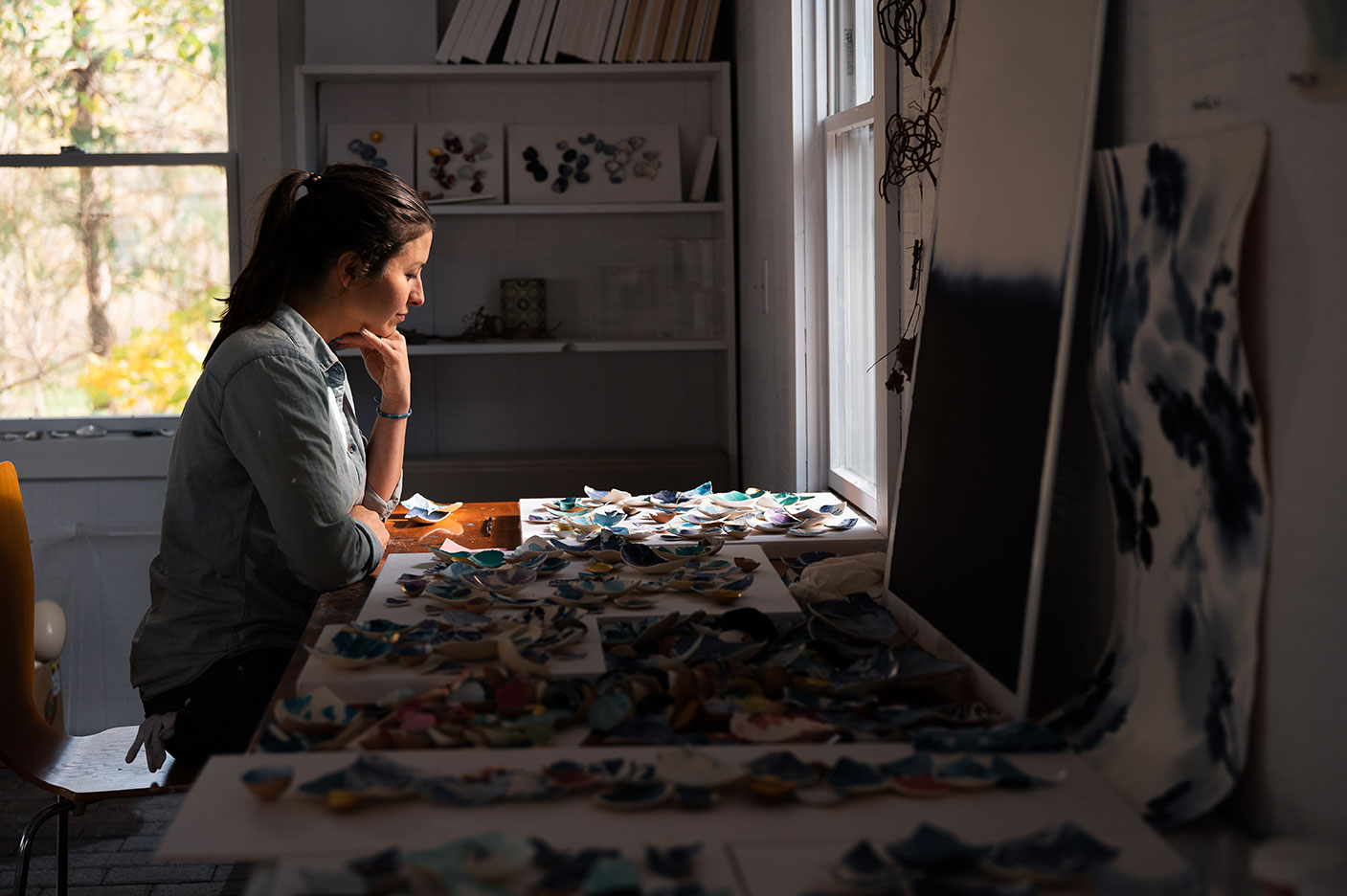 Her works, which span across mediums from fine art painting to kintsugi-inspired eggshell installations, are woven with common threads that ask the observer to ponder the relationship between fragility and strength, to embrace a staggering spectrum of color, and above all, to notice the indelible mark of the natural world on everything we consider beautiful and valuable.