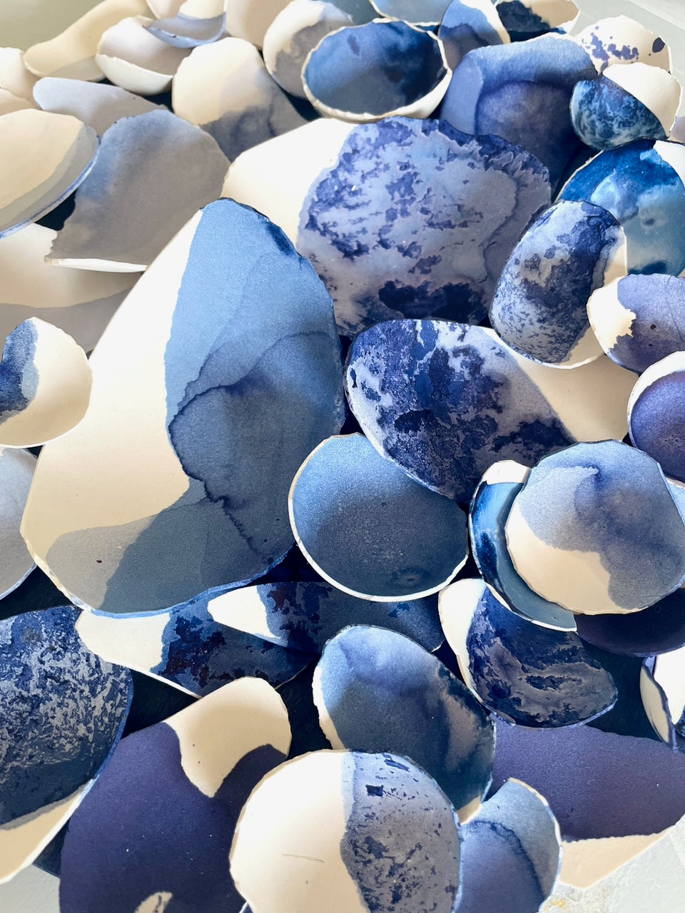 These ceramic sculptures not constrained by a frame, they take on an organic composition. They are easy to hang and build on as a collection. The contrast between the blues and the 23k gold is really plays with contrast and highlights beautiful gold glint!