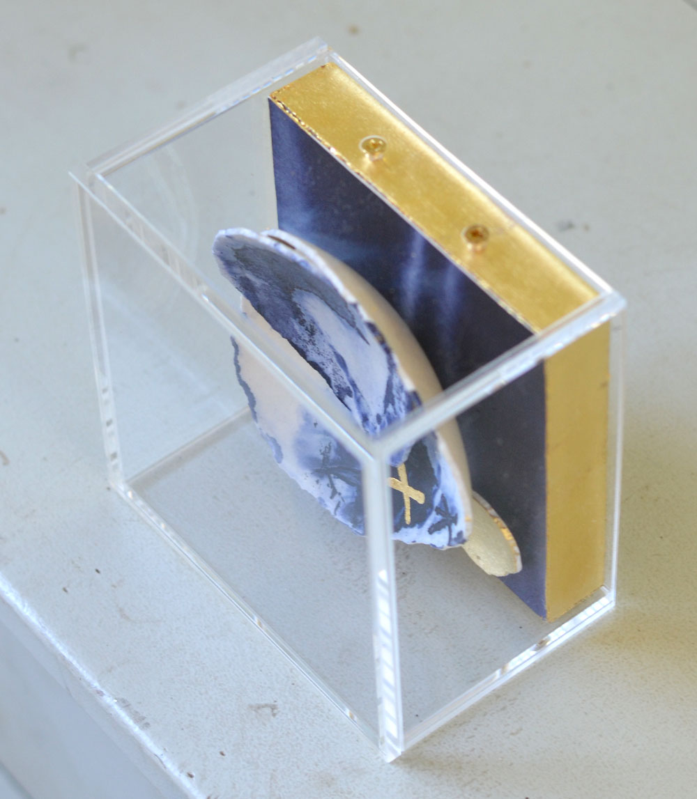 MATERIALS: eggshells, ink, paint, 24k gold leaf, white linen