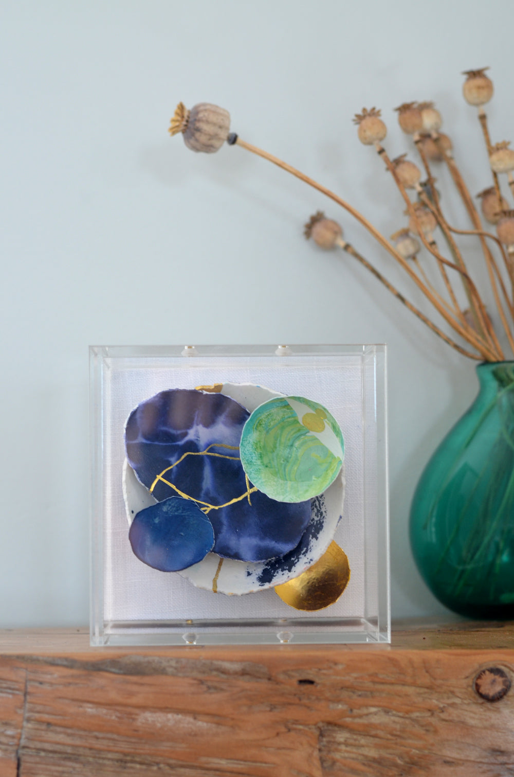 Gorgeous framed art for your home or for gifting, each eggshell is painted individually, and gold metal leaf is applied to represent the repairs that are typically made to pottery by kintsugi artists.