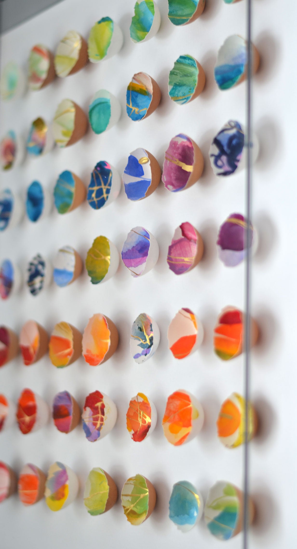 MATERIALS: eggshells, ink, paint, and 24k gold leaf