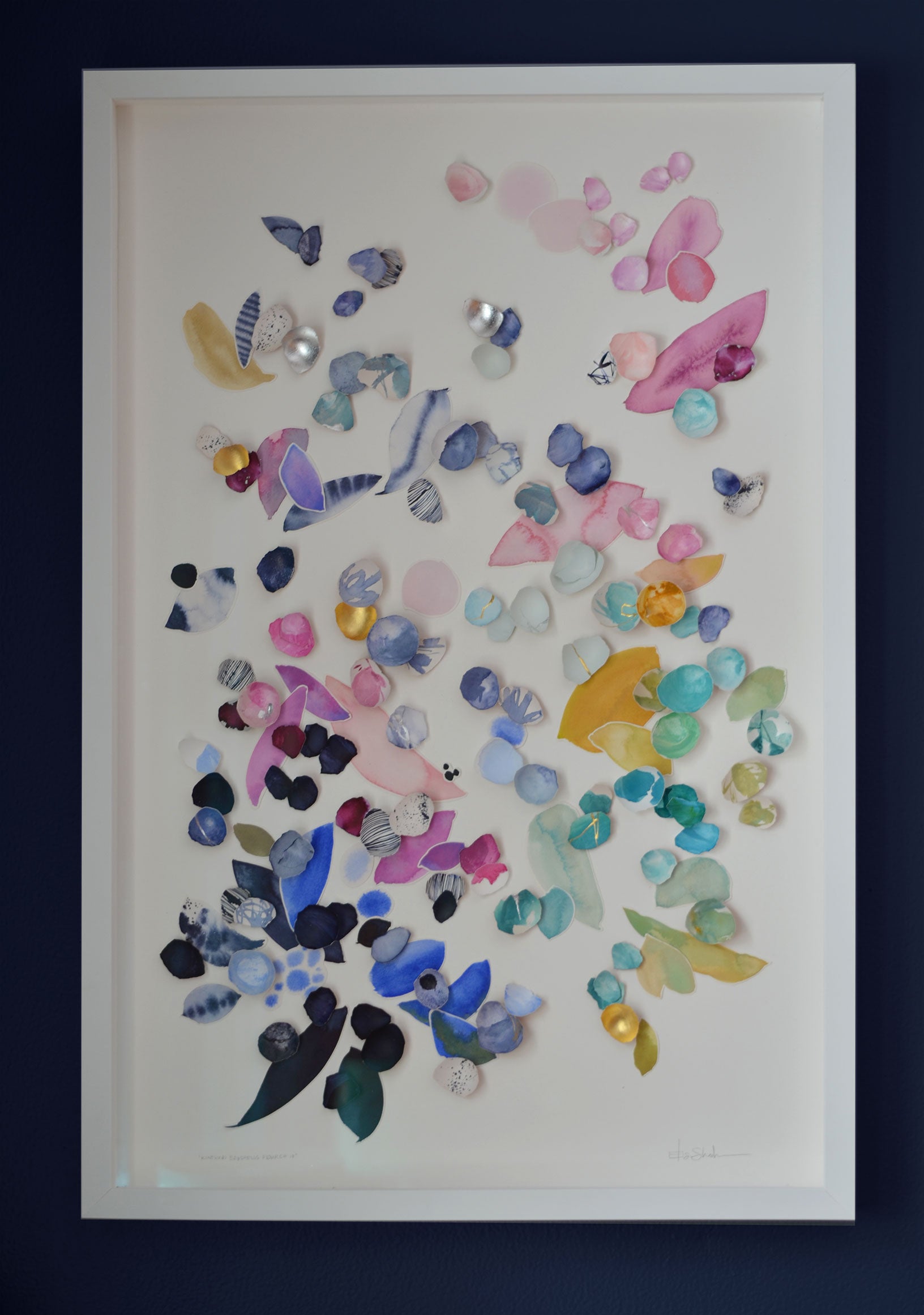 Painting meets eggshells in this sculptural piece. Hand painted botanical shapes are paired with eggshells, collage style, in a gorgeous palette. The shapes just dance around here! The top notch museum glass on these frames is nearly invisible and very low glare. This piece checks so many boxes.