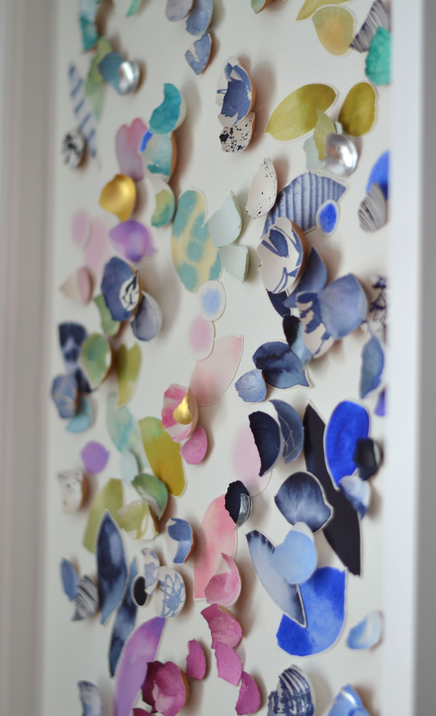 Painting meets eggshells in this sculptural piece. Hand painted botanical shapes are paired with eggshells, collage style, in a gorgeous palette. The shapes just dance around here! The top notch museum glass on these frames is nearly invisible and very low glare. This piece checks so many boxes.