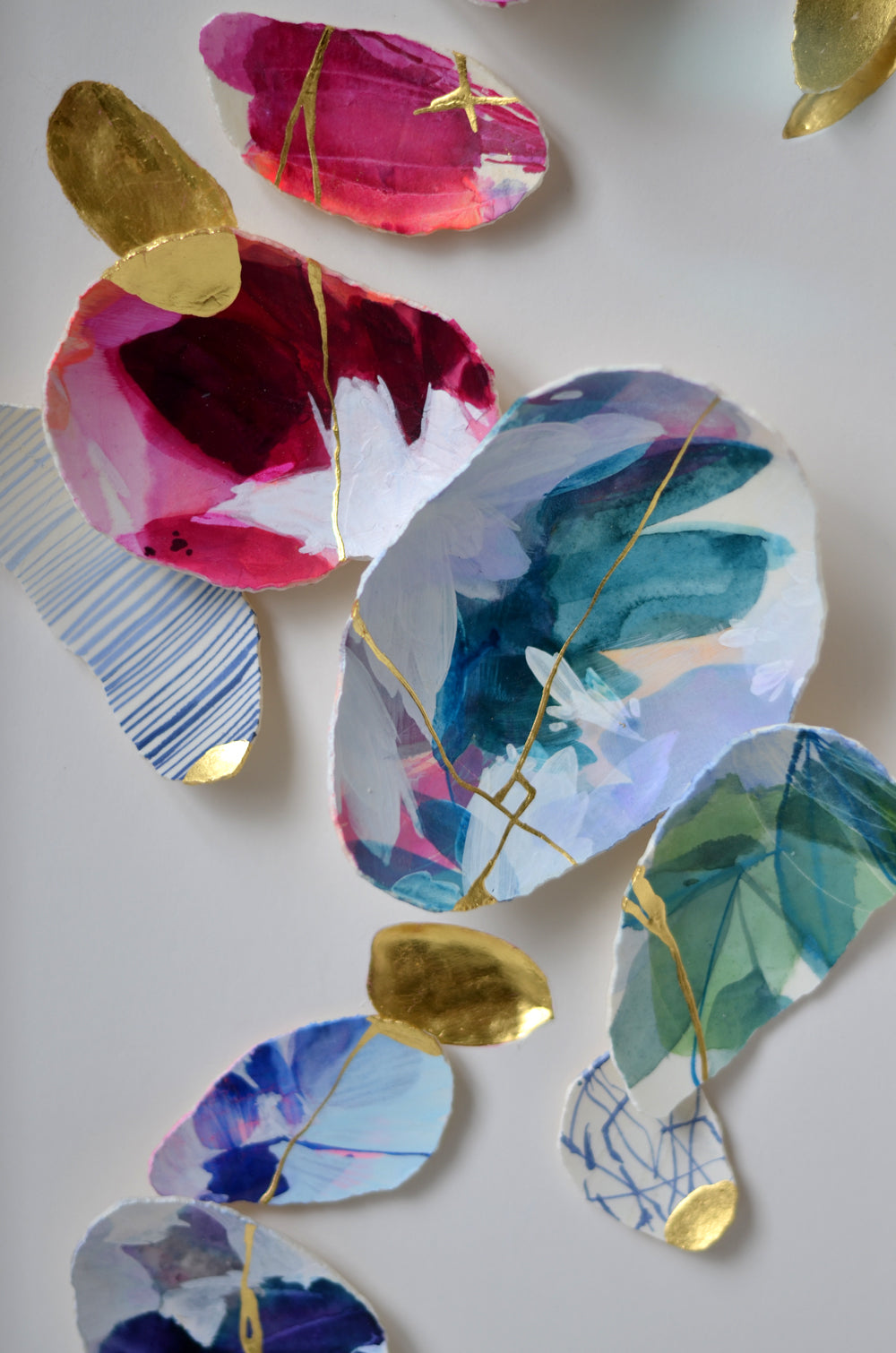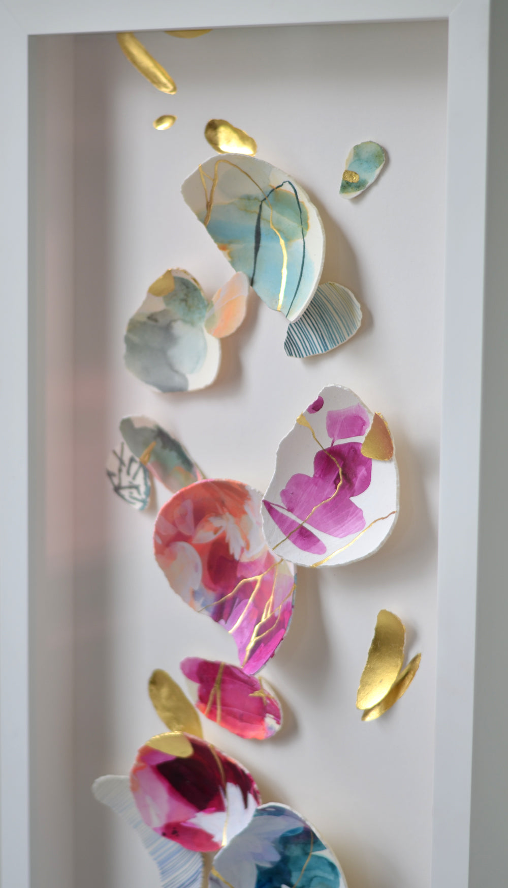 All about dimension in this stunning piece! There are layers of intricately placed eggshells above the surface, and gold-leafed carved niches bringing the eye to examine below the surface. This piece showcases a depth of textures and details, featuring gold leaf not only on the intricate kintsugi style paintings on ostrich eggs, but in carved into the background.