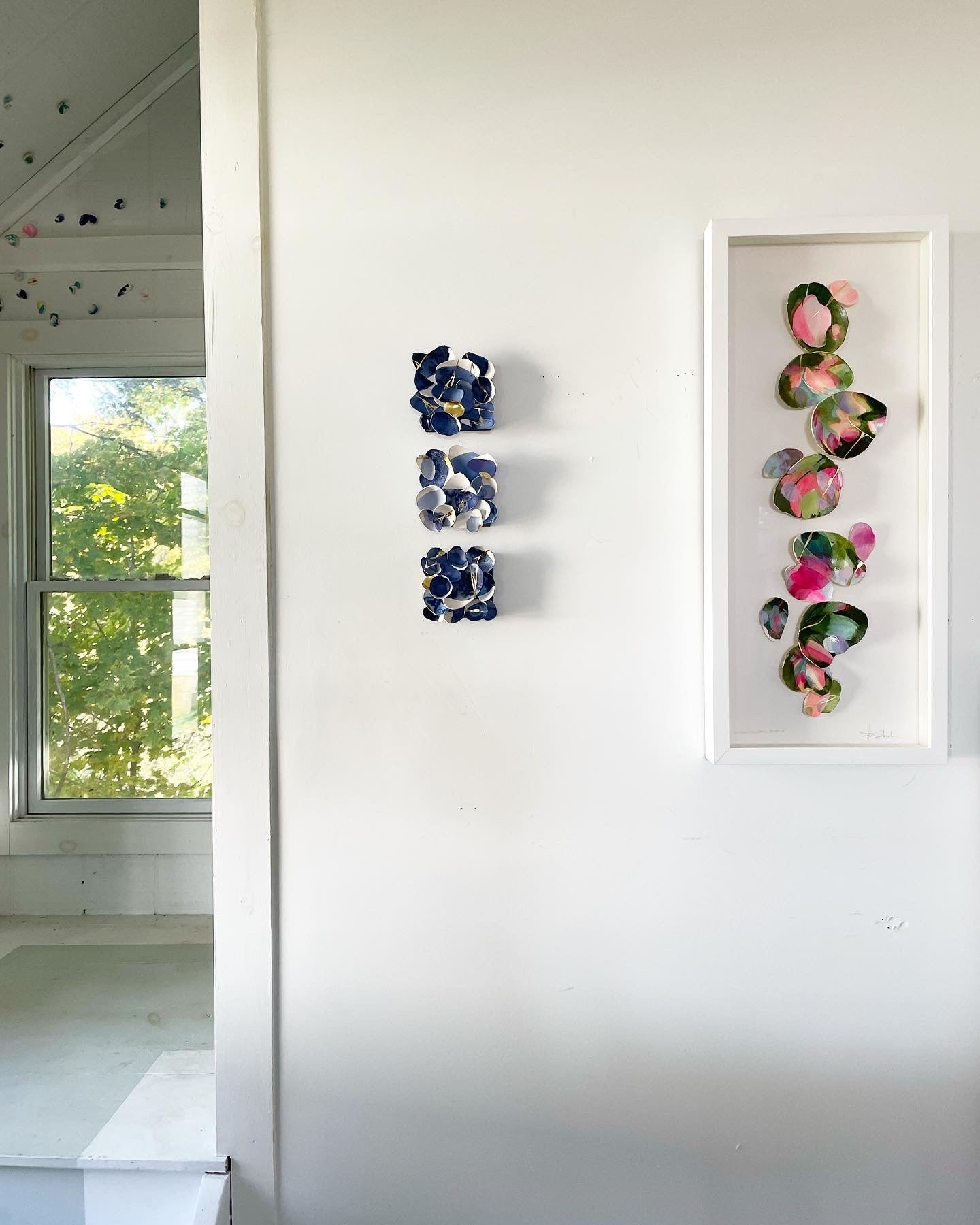 These ceramic sculptures not contrained by a frame, they take on an organic composition. They are easy to hang and build on as a collection. The contrast between the blues and the 23k gold is really plays with contrast and highlights beautiful gold glint!